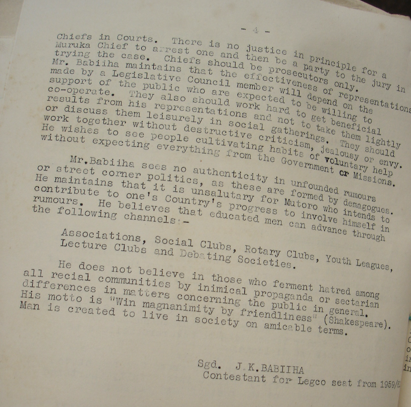 His platform for the 1958 LegCo election: he 'sees no authenticity in unfounded rumors or street corner politics. He maintains that it is unsalutary for a Mutoro...to involve himself in rumors'.