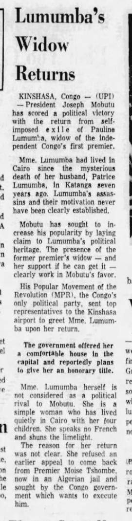 Mme. Lumumba returned to the Congo in September 1968--7 years after her husband's murder. She was made into a heroine by Mobutu's government.
