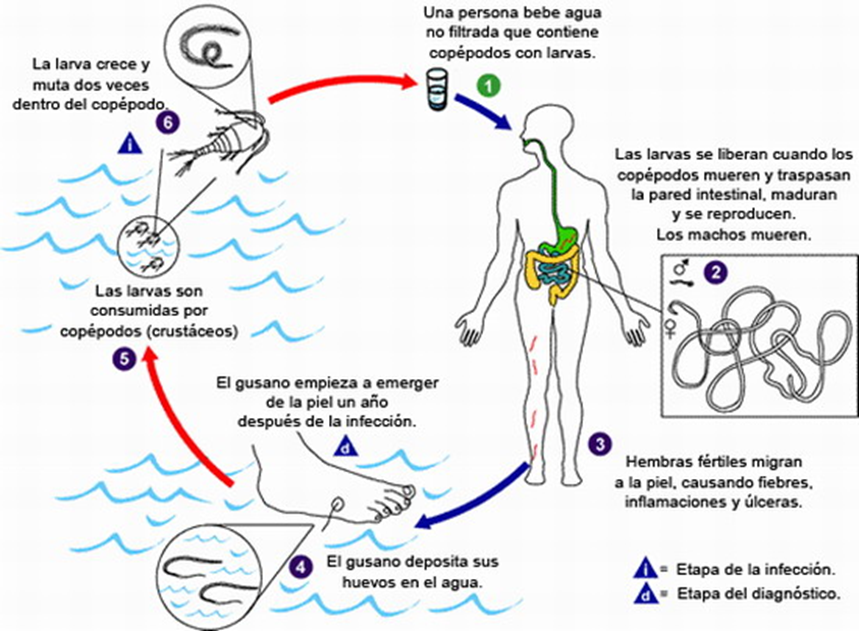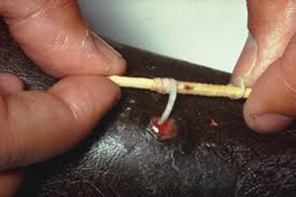 5/ Cuando el gusano emerge hay q enrollarlo en un palito y tirar lentamente para q no se rompa, la extracción puede durar 1 mes