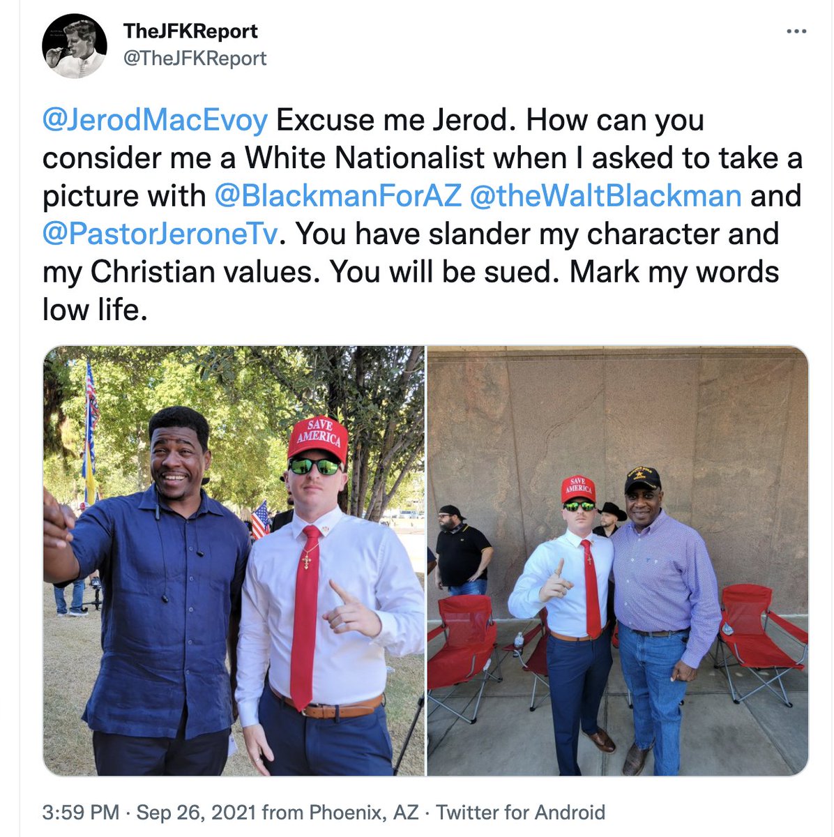Jackson tweeted, as we note, a photo with Arizona congressional candidate Walt Blackman that showed a man in Proud Boys attire in the background of it.