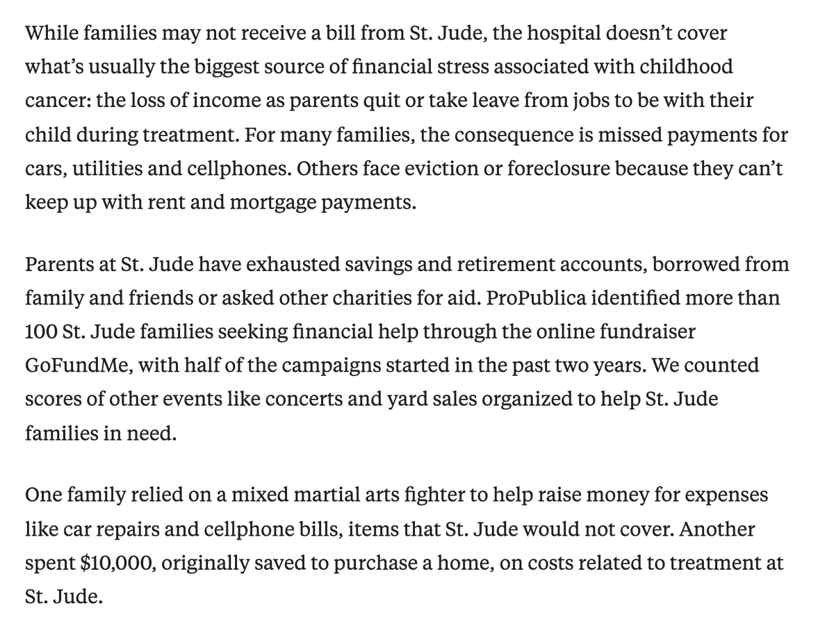 I have huge issues w/the framing of this article on St. Jude as someone who has written about/experienced financial burdens related to childhood cancer. It hangs a lot of these issues on SJ, when they're one of the only institutions trying to address them