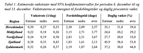 The models are based on this data from the spread of O in the five Danish regions. In the capital region ("Hovedstaden"), where most infections occur, O is to have a daily growth rate of .30, a doubling time of 2.3 days and a daily growth of 35 %. (4/9)
