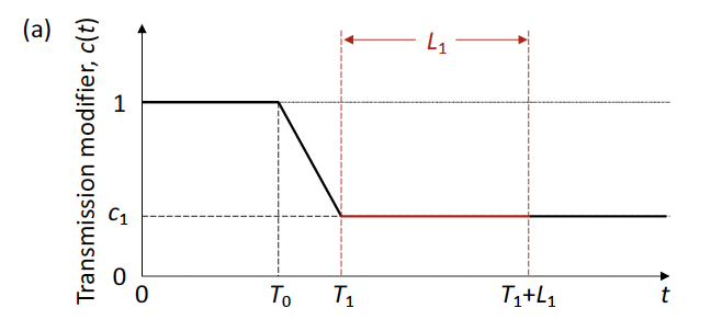 t is time, T0 when behavioural change starts impact epidemic, T1 when 1st lockdown begins (study countries had lockdown in spring 2020), L1 lockdown duration (until sometime in May). After L1 we had assumed a particular slope for resumption of contacts, which led to HIT~10-20%.