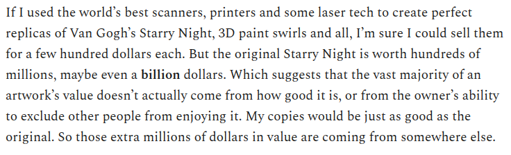 NFTs were partly about creating scarcity for digital art, so buyers could own an intangible *something*, like in my Starry Night analogy here, that held its extrinsic value.