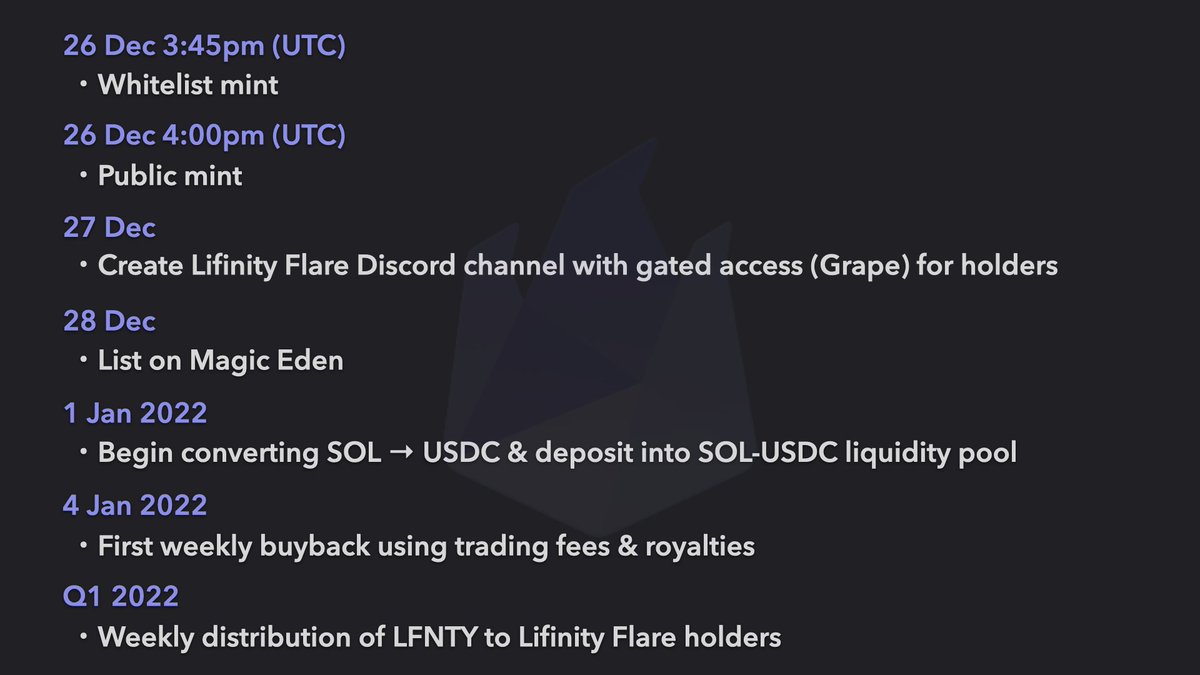 In addition to buying back Lifinity Flares with revenue, if the floor price ever falls below 50% of the mint price, we will buy all Lifinity Flares below that price using the pooled funds.