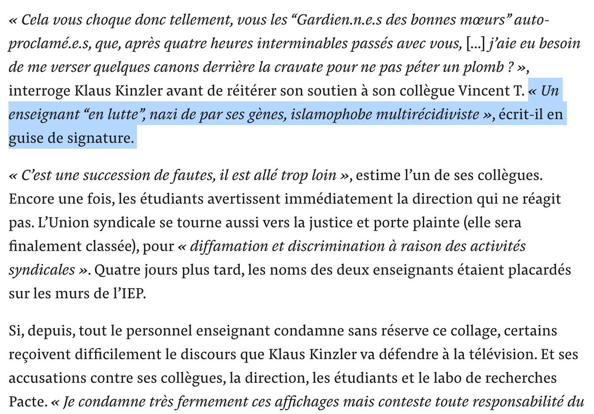 Comme de nombreuses contrevérités sont relayées sur Sciences Po Grenoble, rappel des faits : Le professeur Klaus Kinzler avait menti sur de nombreux points. Le Défenseur des droits avait d'ailleurs pris la défense des autres profs attaquées. mediapart.fr/journal/france…