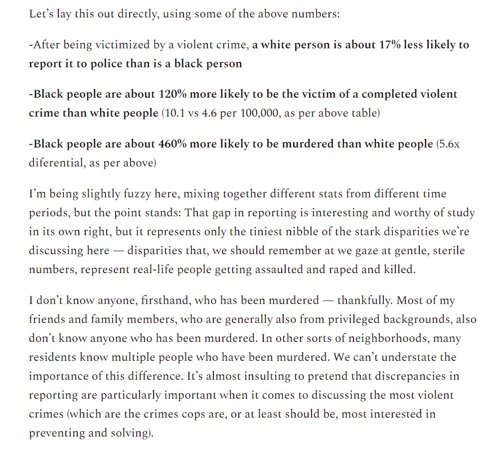 3/ Yes, there's some data suggesting discrepancies in the rates at which people report crime. But there's also data showing that the disparities in *actually experiencing* crime tend to be more than an order of magnitude larger. Gizmodo and The Markup ignore this entirely.