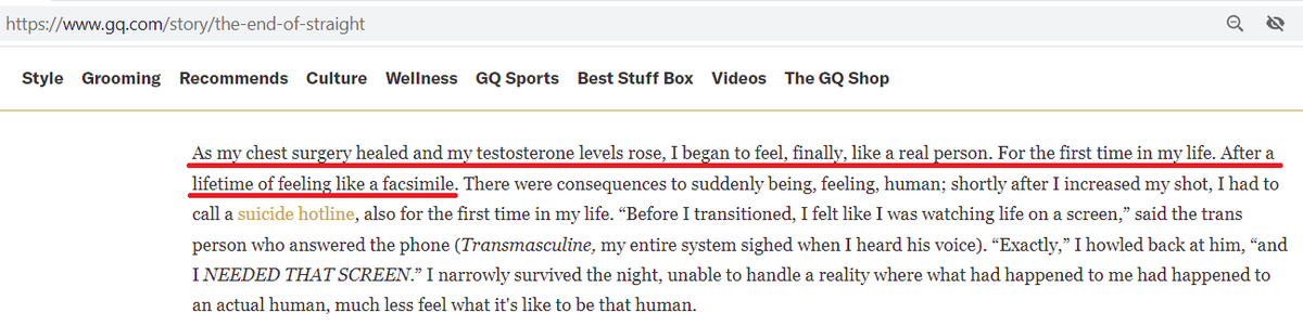 5/ Author of the NY Mag piece also wrote, in GQ in 2019, that he'd been more or less cured of his mental-health/identity problems by hormones and top surgery. Not long after that, he needed more surgery so desperately he poured his life savings into it.