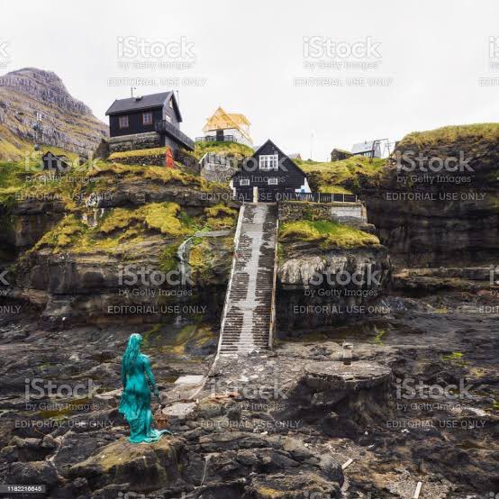 …hoy en día, se puede observar una bella, maravillosa e impactante escultura en el pueblo de Mikladalur, una Kopakonan, y las olas del mar, rompen tras ella, dándole una majestuosidad, digna de ver.