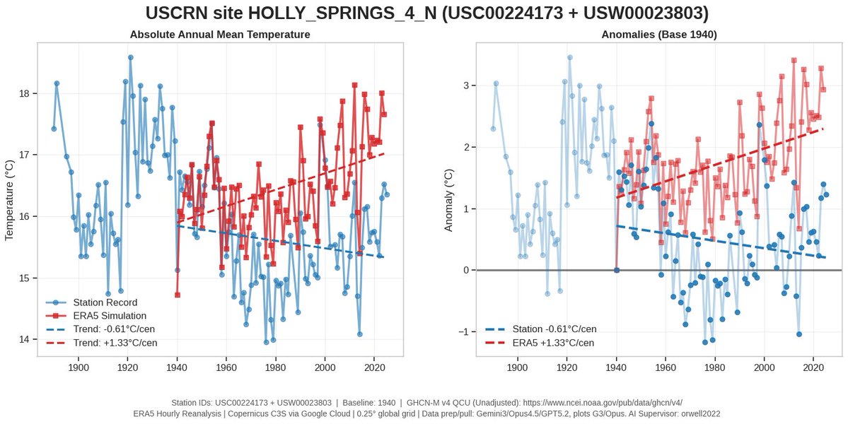 So we test it: ERA5 vs USCRN on grid level. Result: cooler past, warmer present pivot in ERA5 vs stations. Model ❌