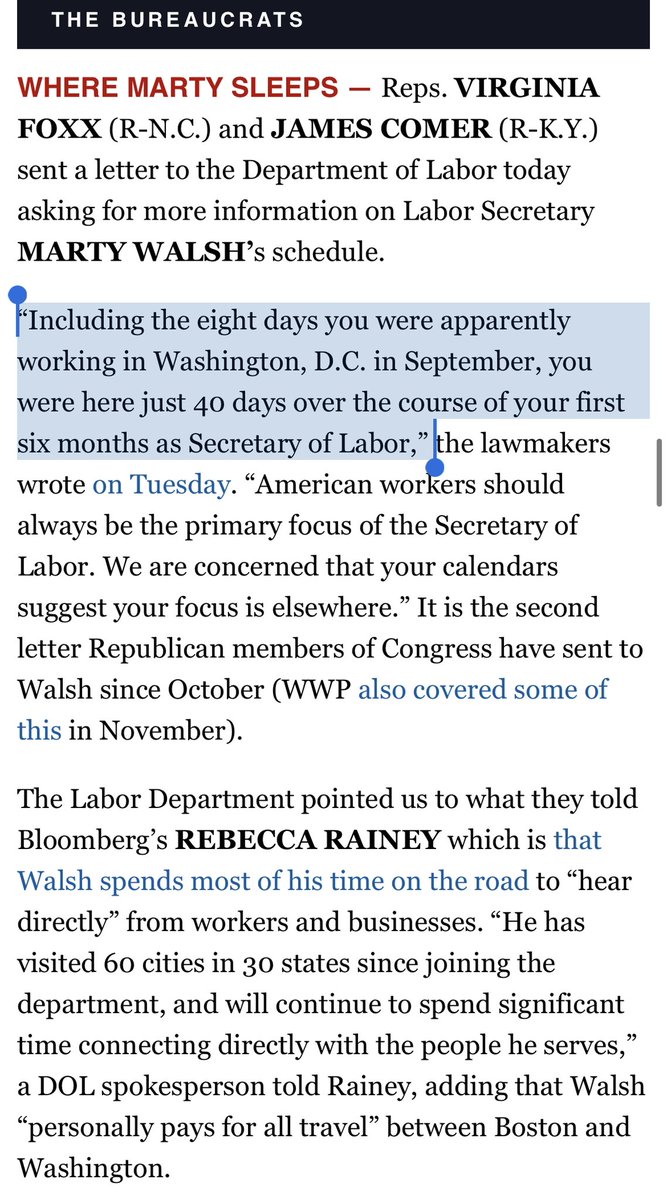 2 GOP ranking members send a letter to Walsh: “Including the eight days you were apparently working in D.C. in Sept, you were here just 40 days over the course of your first six months as Secretary”