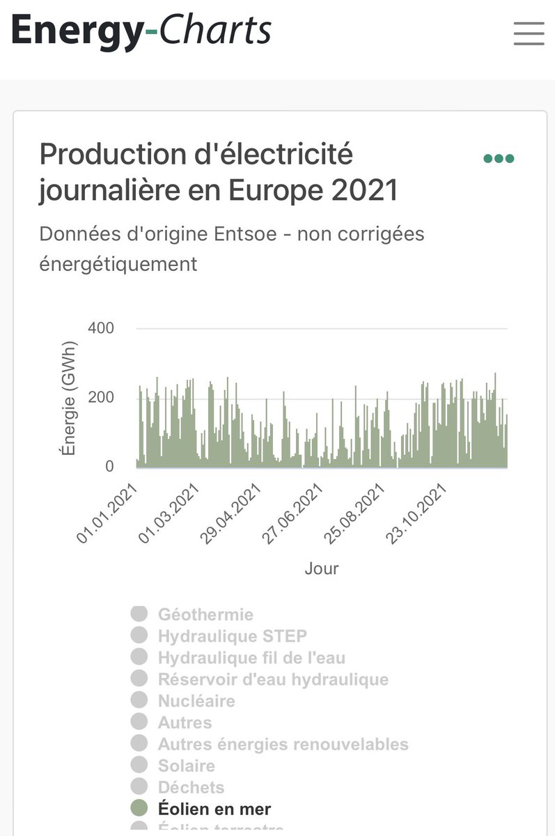Même s’il y a 10x moins d’éoliennes offshore que d’éoliennes terrestres, et que cet offshore est principalement présent dans le nord, les 5000+ éoliennes offshore européennes couvrent quand même une très vaste zone géographique. Il ne faut donc pas s’attendre à une variabilité…
