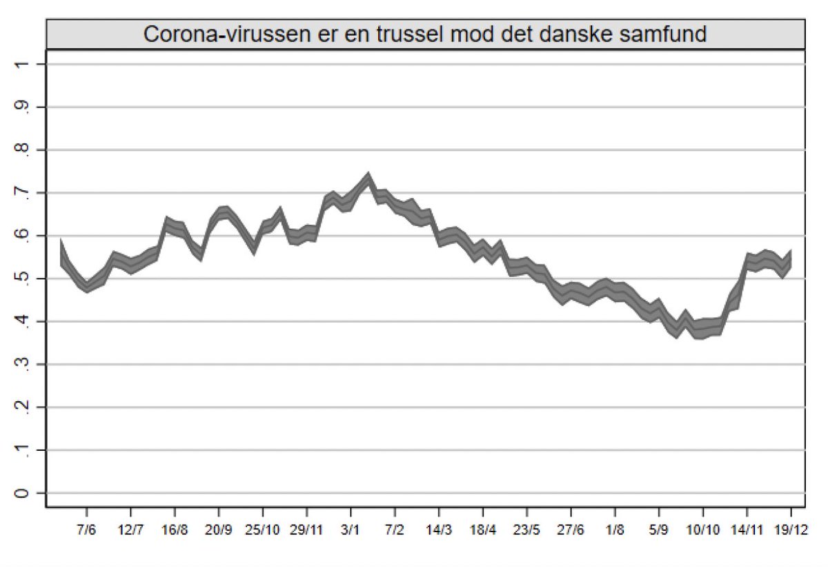 Borgernes bekymring er relativt høj og steg kraftigt, da man opdagede at også vinteren '21 ville blive en corona-vinter. Bekymringen er dog ikke steget siden omikron spredte sig. Det tyder på, at borgerne stadig er afventende ift. hvad omikron betyder for vinteren. (2/4)