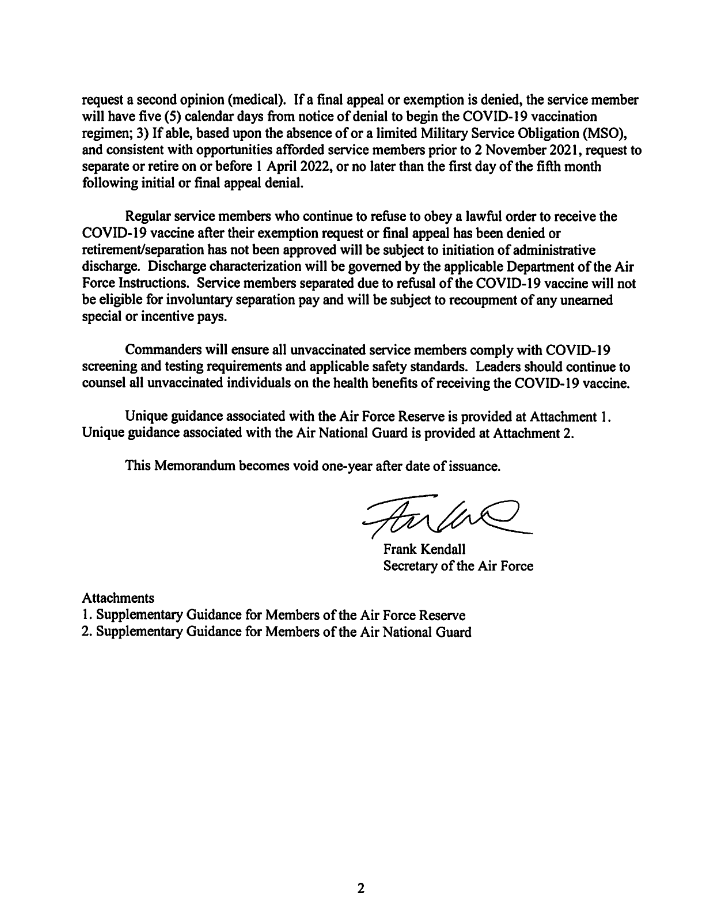 This Dec 7 SecAF Memo states that unvaccinated service members will be subjected to discharge within 5 calendar days if their final appeal or exemption is denied. af.mil/Portals/1/docu…