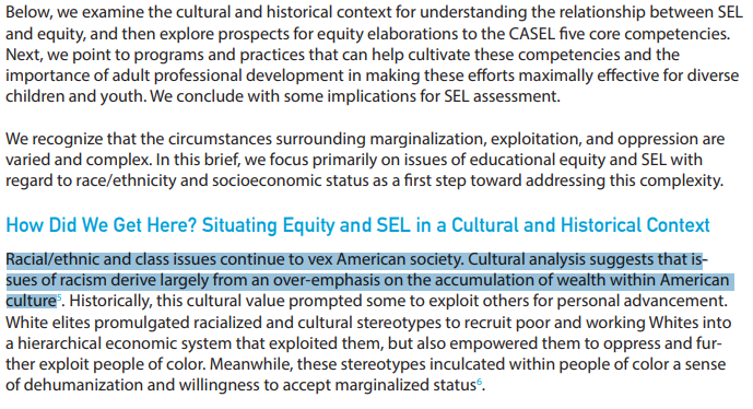 You can see how CASEL changed their definition of SEL to "Transformative SEL" and how they changed all the 5-core competencies taught through social emotional learning to be a lever for equity (equal outcomes) in their white paper. measuringsel.casel.org/wp-content/upl…