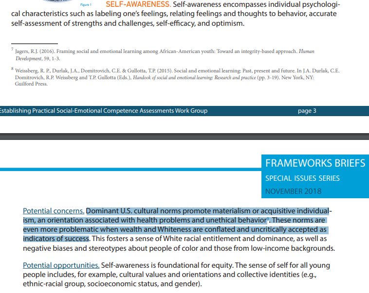 Social Emotional Learning standard-bearer CASEL wants to make "wealth and Whiteness" (their view of capitalism) the bad guy and use SEL to focus on collective identities and "educational equity" (equal outcomes) through their competency of "self-awareness."