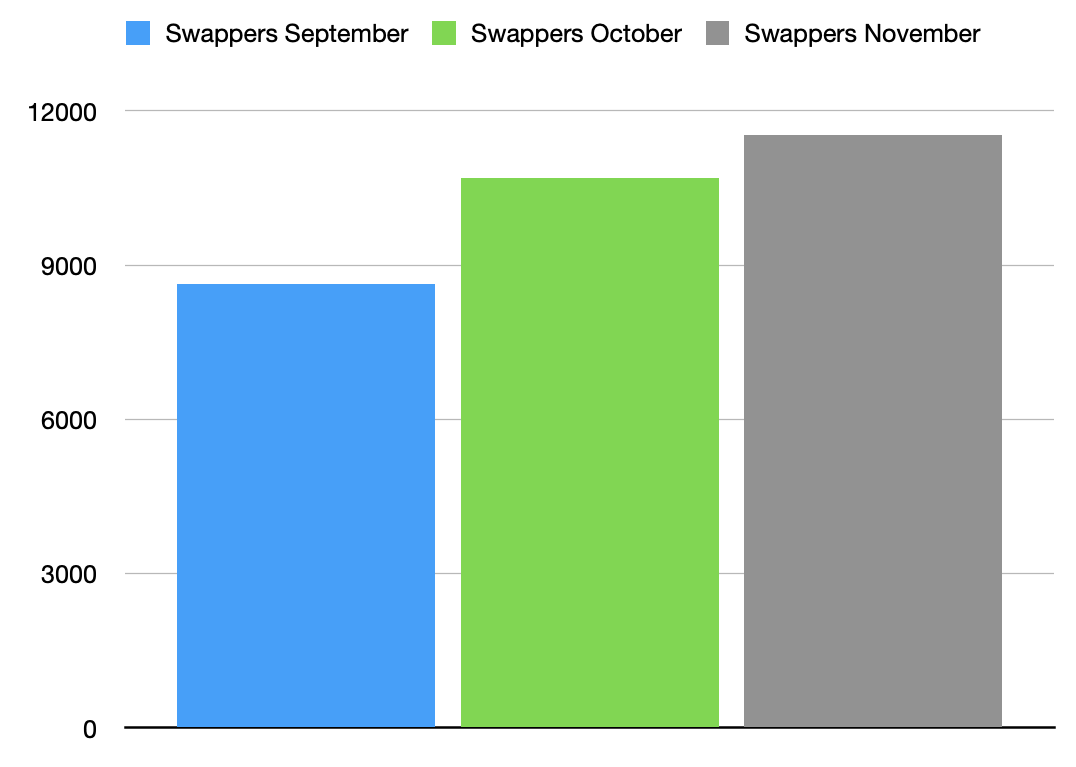 3/ Next lets look at the number of unique addresses swapping on Step, reaching almost 12 000 in November. Continued steady growth here, this is also organic to Step as no aggregators were connected then and our SDK wasnt ready September.