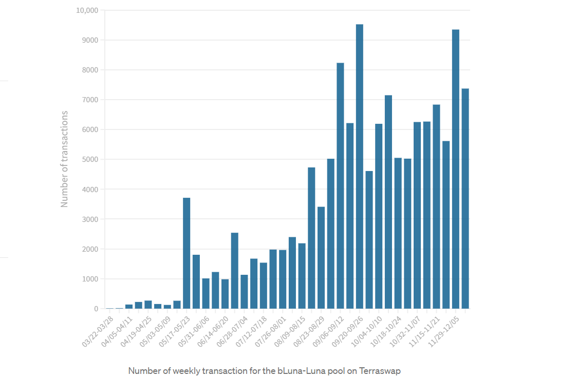 By plotting the number of weekly transactions occurred for the bLuna-Luna pool, we can observe that the number has steadily increased over the last year