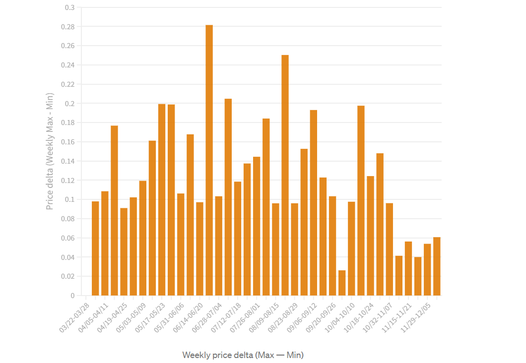 Plotting the delta between the max and min weekly bLuna price we can observe that this delta has become smaller over time.