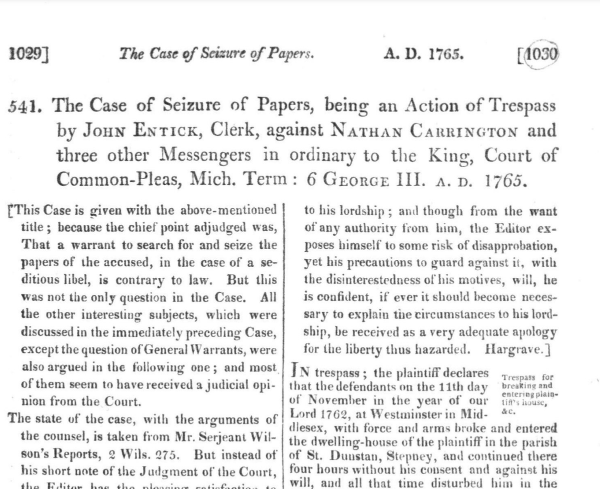 Entick v. Carrington (1765), was a major inspiration for the 4A. There are two versions of the opinion, from Howell's State Trials and from the Eng. Rep. It's hard to find them online, so I have post them: