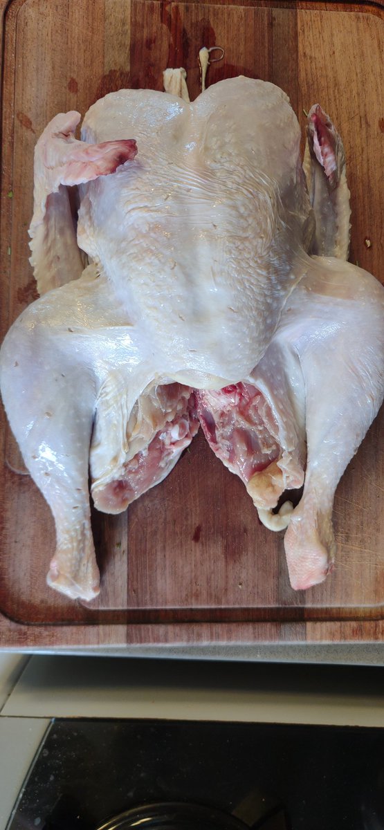 Nós vamos quebrar o esterno dele para que ele fique achatado. Para isso vamos abrir a ave pelas costas e empurrar pra baixo contra o peito.