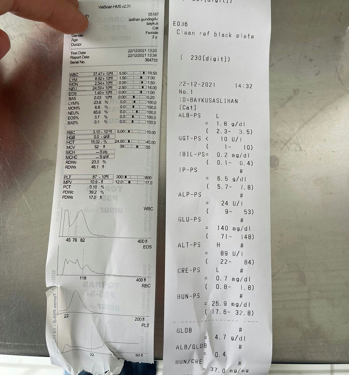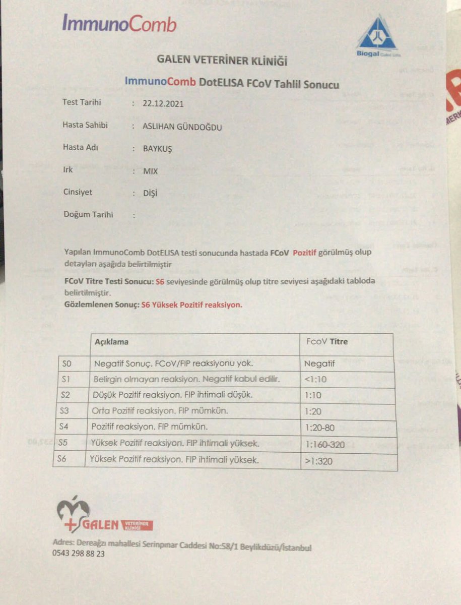 Tahlilleri bunlar. 5 gün önce alb/glob 0.5 ti ve üresi bayağı yüksekti o zaman da fip ihtimali vardı ama biraz gözlemlememiz gerekti, üre için tedavi başladı. Bugün ki tahlilinde alb/glob 0.4'e düşmüş.Hafif dengesizlik de başlayınca elisa testi bakıldı o da en yüksek değer çıktı.