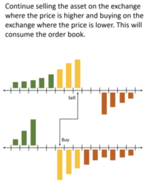 Keep lifting the offer on the lower exchange (#2) & hitting the bid on the higher exchange (#1) until the gap narrows.