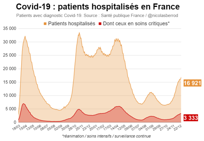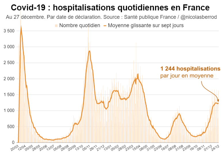 Actuellement, l'immense majorité des hospitalisations quotidiennes sont toujours dues au variant Delta, et leur nombre baisse lègèrement. Mais il est possible qu'un rebond survienne ces prochaines semaines avec Omicron, vu le nombre record de cas positifs chaque jour.