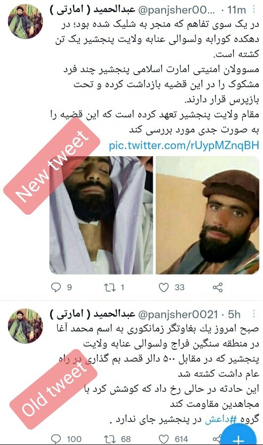 A twitter account attributed to Hamid Khurasani, a former warlord& current deputy chief of police for #Panjshir, wrote that Mohammad Agha was killed by the Taliban while he was placing a bomb in exchange for $500. "There is no place for Daesh in Panjshir."