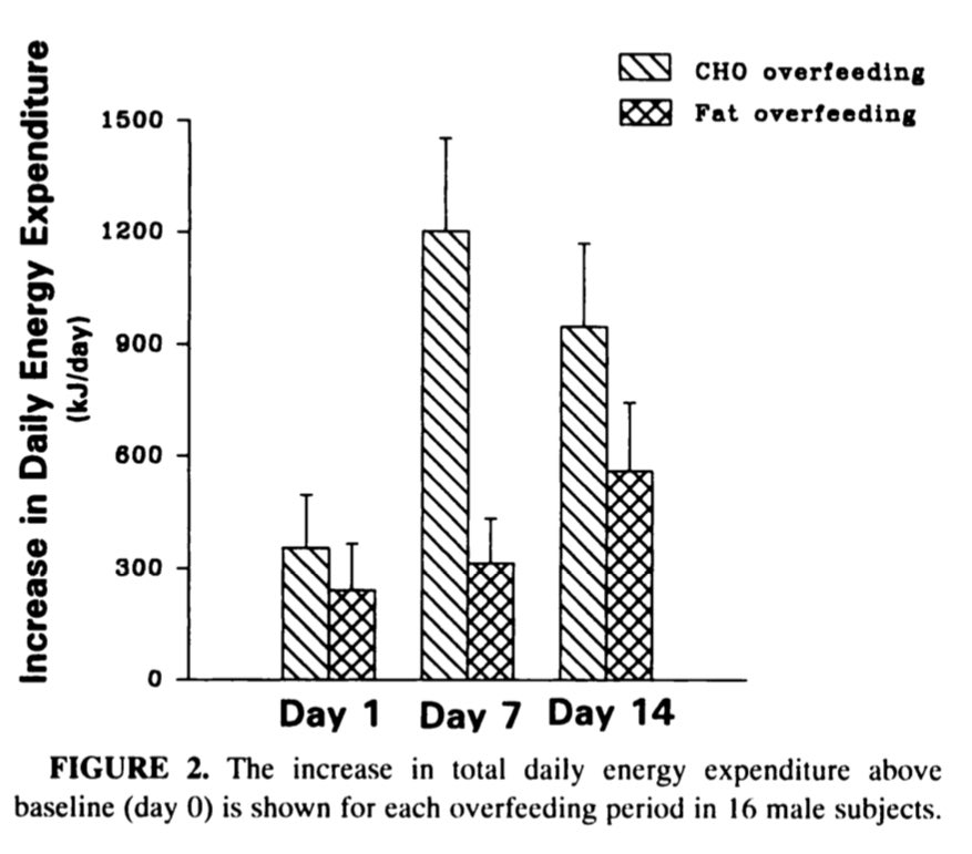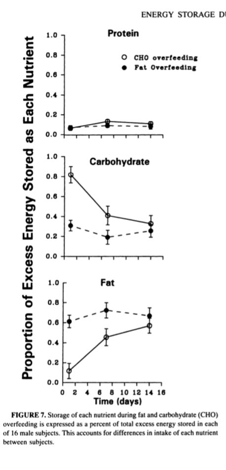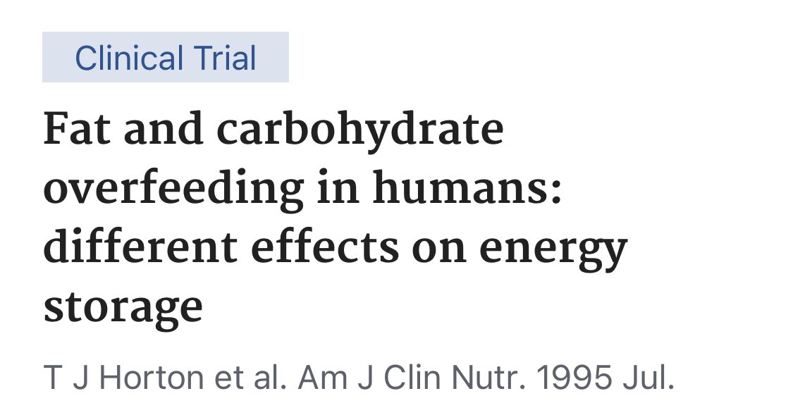 🎄Ahora que son fechas navideñas vale la pena rescatar este estudio clásico de Horton et al 1995 dónde estudian si el mismo exceso calórico proviente de grasas o de carbohidratos generan mayor acumulación de grasa: hilo🧵