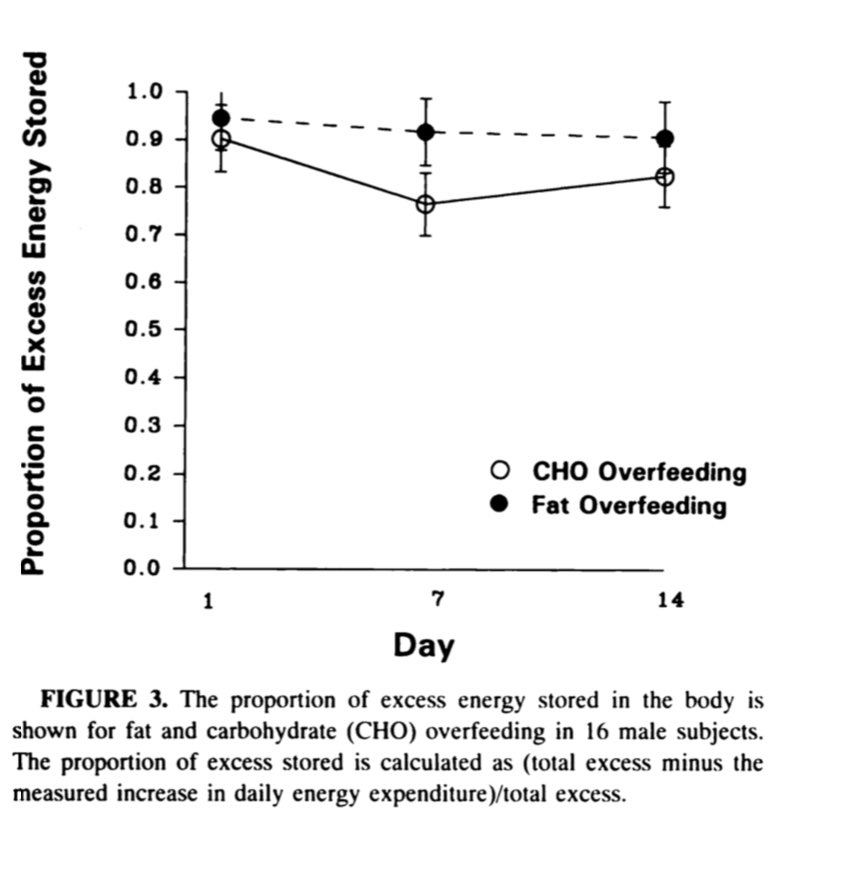 ✍️En este estudio, una sobreingesta de grasa aumentaba la acumulación de grasa en mayor medida que la misma cantidad de kcal consumidas proviniente de los carbohidratos.