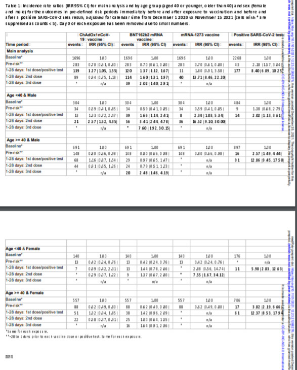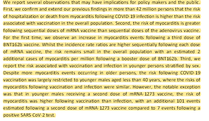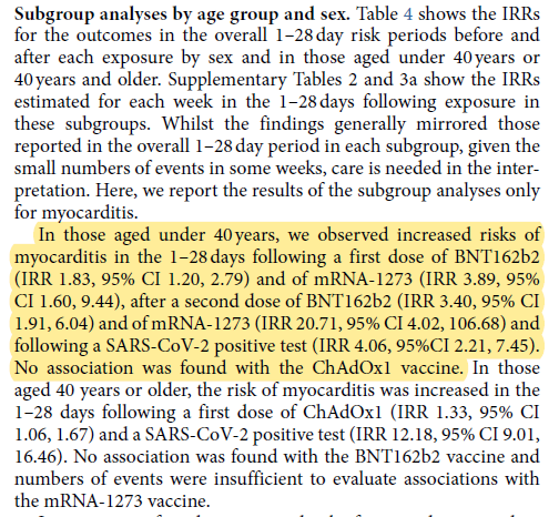 - tato velmi robustní studie skutečně zaznamenala zvýšený výskyt myocarditid cca do 7 dnů po očkování, který však nebyl v celkové populaci vyšší než u onemocnění s výjimkou skupiny <40 let (muži i ženy!) po 2. dávce Moderny (15 vs 10 případů na MILION dávek).