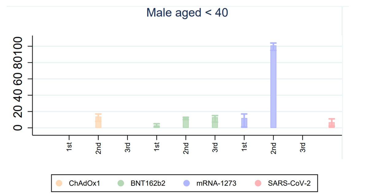 Asociace výskytu myocarditid byla nejčastější u mužů mladších 40 let a zejména po 2. dávce: při přepočtu na MILION dávek se jedná o 14 (Astra), 12 (Comirnaty), 101 (Spikevax) a 7 (ONEMOCNĚNÍ) výskytů navíc.