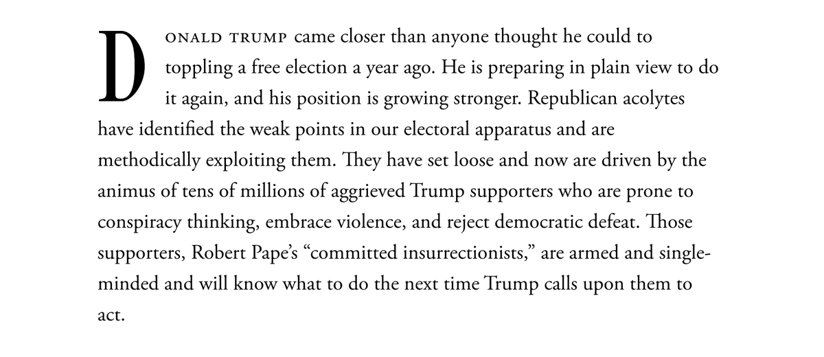 3/ “If the plot succeeds, the ballots cast by American voters will not decide the presidency in 2024,” Gellman writes. “Thousands of votes will be thrown away, or millions, to produce the required effect.”