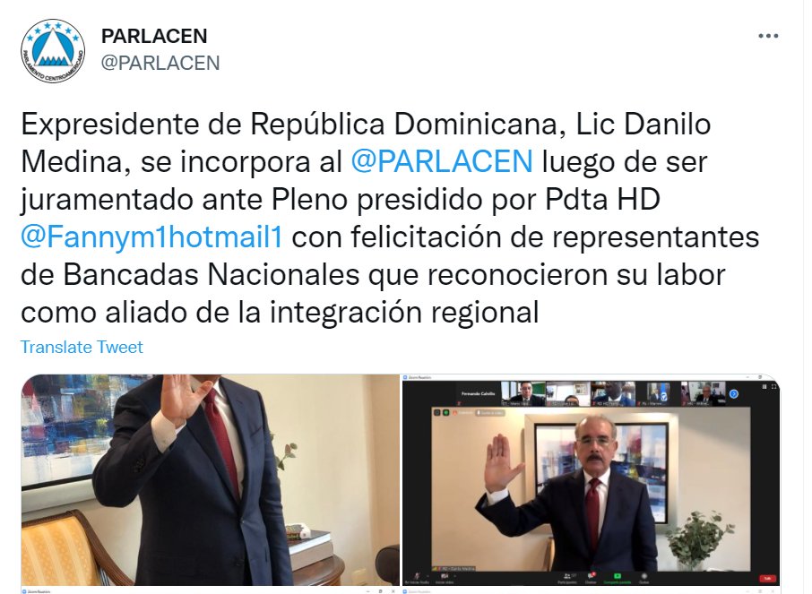 6/Ahora, el primer paso para JOH es ser juramentado. Debido a la pandemia, el PARLACEN aprobó un reglamento especial que permite la juramentación via internet. Así fue juramentado el expresidente de la Republica Dominicana, Danilo Medina, el 10 de noviembre 2020.