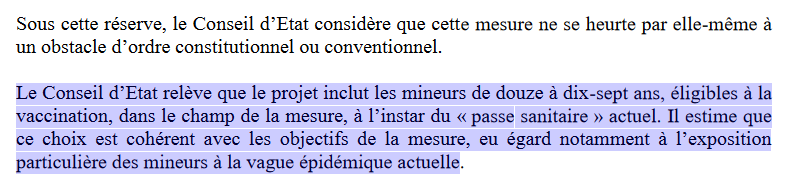 S'agissant du fait que les adolescents de 12 à 17 ans seront également soumis à ce futur pass vaccinal, le CE estime que ce choix est "cohérent, eu égard notamment à l’exposition particulière des mineurs à la vague épidémique actuelle".