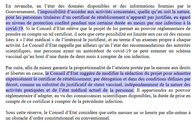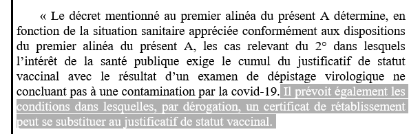 @florencemehrez Dans le projet de loi soumis au Parlement, il est simplement indiqué qu'un décret prévoira "les conditions dans lesquelles, par dérogation, un certificat de rétablissement peut se substituer au justificatif de statut vaccinal".