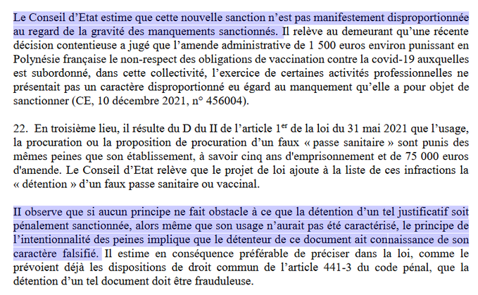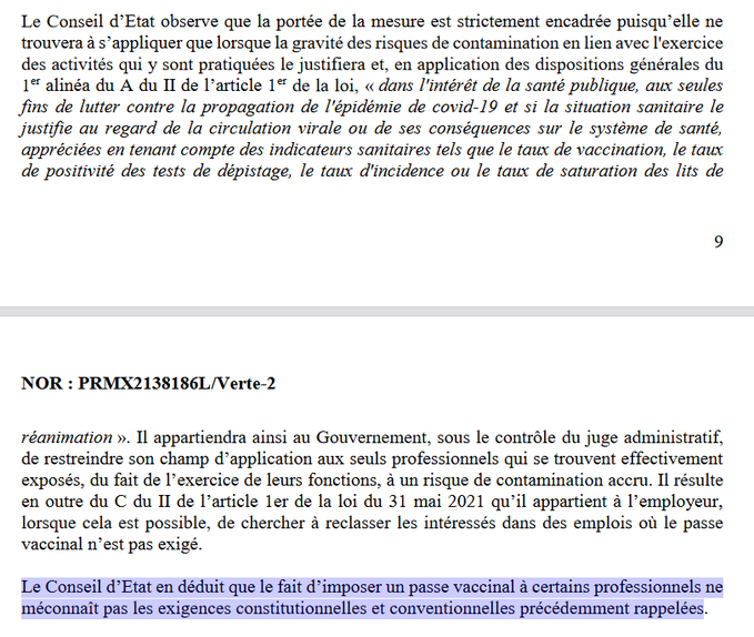 Pour l'application du pass vaccinal à certains professionnels (soit une obligation vaccinale pour travailler), le CE n'y trouve rien à redire. Notamment car "l’instauration d’une obligation vaccinale s’inscrit dans un cadre constitutionnel et conventionnel bien établi".