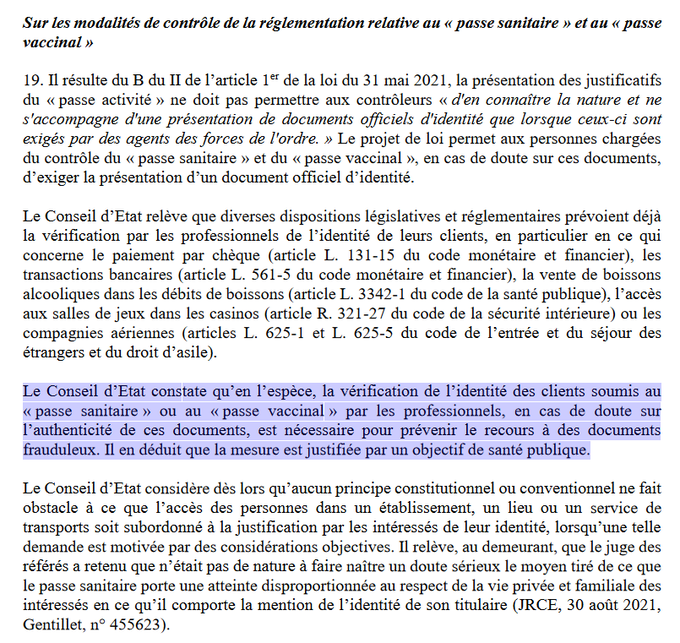 Le Conseil d'Etat "valide" également le contrôle, par les professionnels (restaurateurs, gérants de cinéma, etc), de l'identité des clients détenteurs d'un pass vaccinal. Cette vérification en cas de doute est "nécessaire pour prévenir le recours à des documents frauduleux".