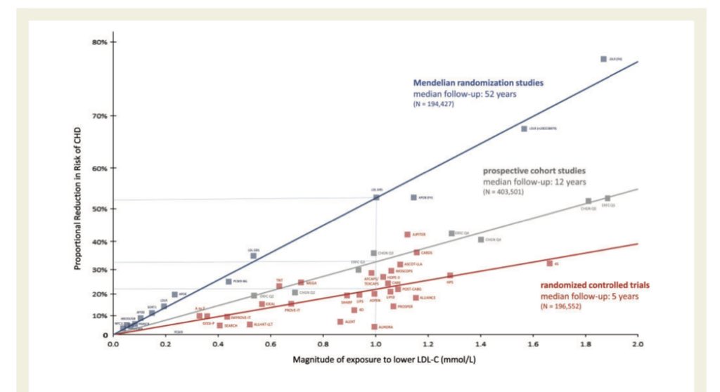 16/ Side note: Observational studies show higher HDL-C = lower risk of CHD but genetic & RCTs show clearly that raising HDL-C does not lower risk. A clear example of a biomarker that’s associated with risk but not part of of the causal chain. This is a regular point of confusion.