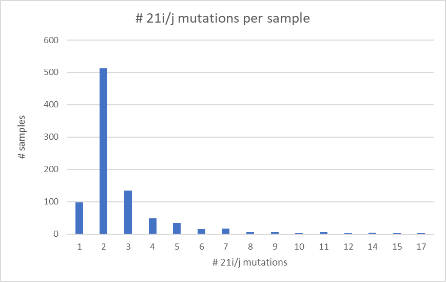 Here we can see that most of the samples are with 1-3 delta mutations. As we go to higher #delta mutations the probability for this to be a lab contamination is going up.