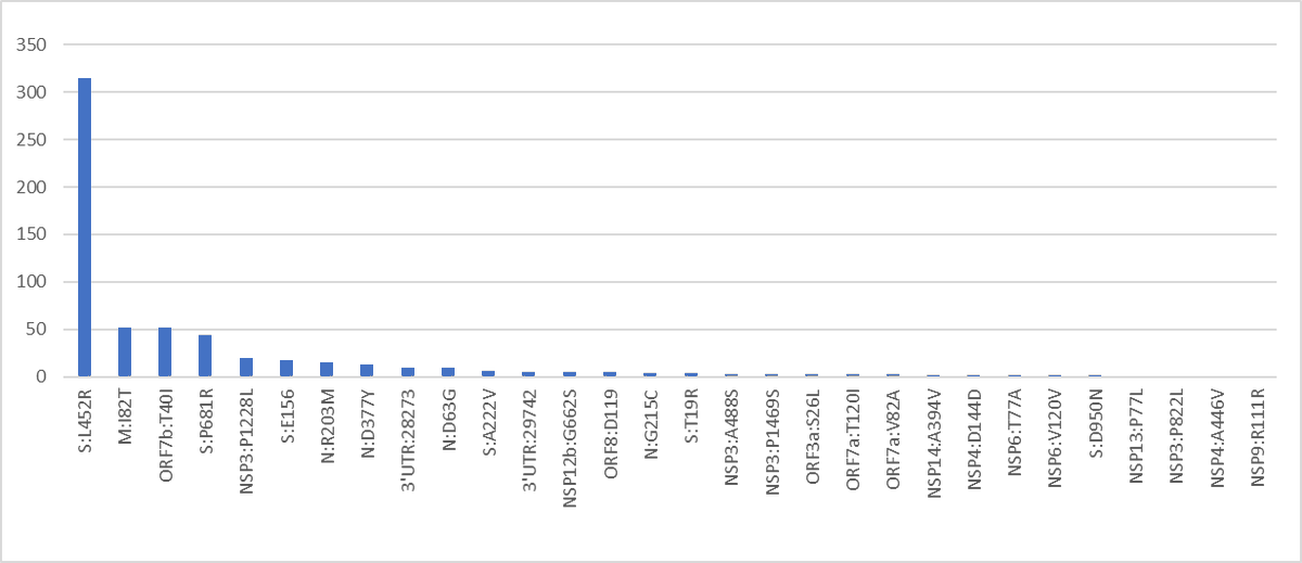 Here are the # of samples with each mutation. What pops up immediately is that the most prevalent ones are the more converged with other variants.