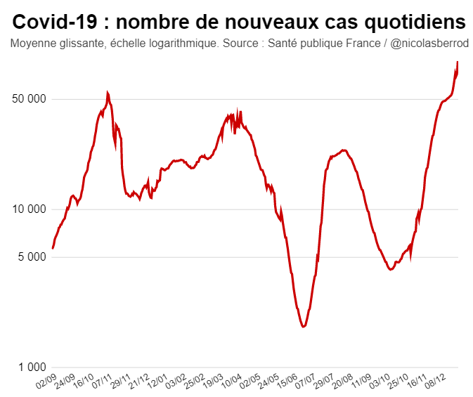 • 87 500 cas sont recensés chaque jour en moyenne (+61% en une semaine).