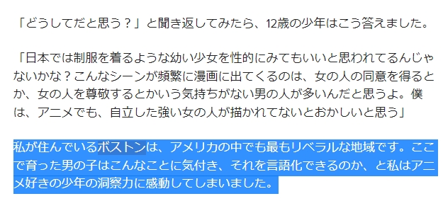 「ボストンの少年の違和感によって、日本は危険な社会であることが図らずしも証明されましたね」というが、少なくとも「女の人の同意を得るとか、女の人を尊敬するとかいう気持ちがない男の人」が40倍はアレなことしているのがボストンである。