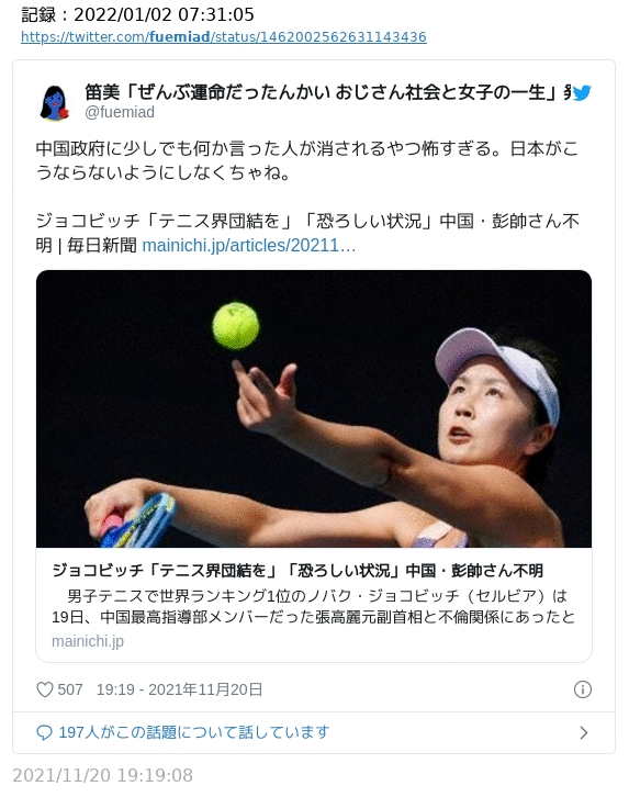 逆に私は話題になったフェミニストたちがいるとや、そのつぶやきを仔細に調べてみているのだが、誰も中国の有名テニスプレイヤーが、共産党高官に性の慰み者にされたことを告発したら、行方不明になった事件を呟いていない。性被害に「沈黙」を強いられる女性たちに声をあげなくてはいいのだろうか。