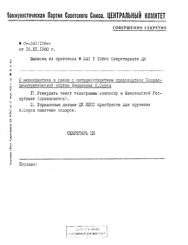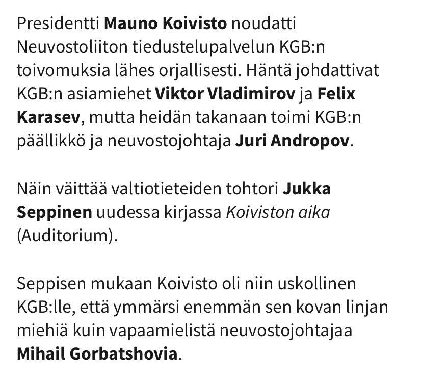 Kylmän sodan Suomessa oli mahdollista joutua KGB:n salamurhaamaksi, mikäli oli antikommunistinen demari, joka uhkasi suosiollaan SDP:n johtoasemissa ollutta KGB:n agenttia.