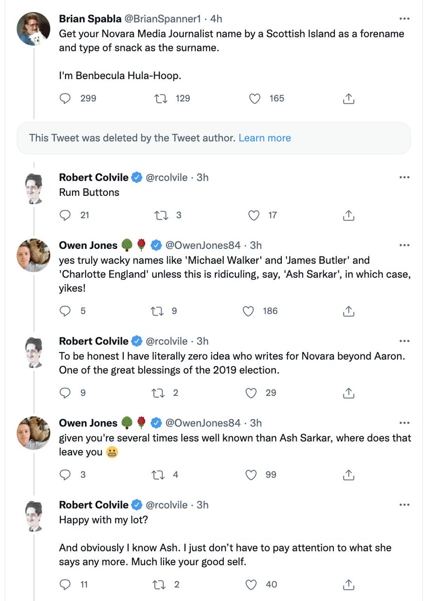 The original thread had triggered, really quite predictably, a load of overtly racist bile. That was my objection, and the fact some of the journalists originally mocking Novara journalists' names deleted their tweets is presumably because they became aware of this fact.