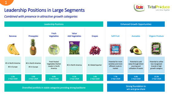 En la siguiente imagen podemos ver cómo queda el MIX de productos que vende la empresa tras la fusión, siendo la banana la fruta más importante.