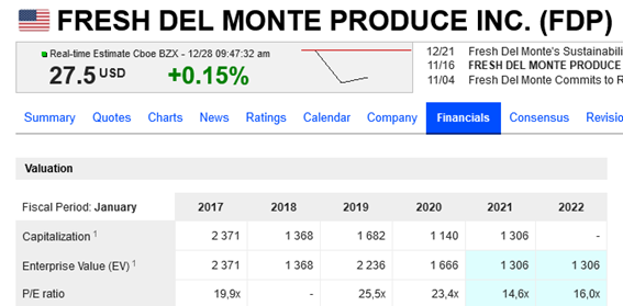 Por ejemplo,si comparamos con su rival más directo Fresh del Monte,vemos que su valoración es de 14,6X beneficios forward o 23,4X beneficios de 2020, el doble o triple que Dole según que beneficio cojamos, siendo Fresh una empresa con menor poder de marca y menor escala que Dole.