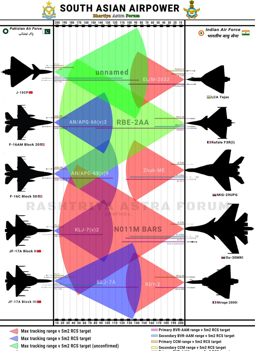 Infographic on South Asian Airpower, describing fighter jets in service (or will be in service within 3 months) of respective Air Force with it's primary radar range and engagement range of A2A missiles in inventory.